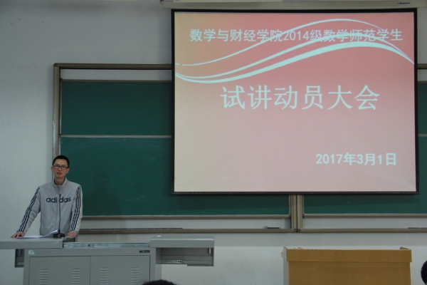 2017年3月1日下午3点,M88在红河八阶召开了2014级数学师范学生试讲动员大会。此次动员大会由陈晓东老师主持召开,M88付天贵等数名试讲指导教师以及2014级数学师范专业学生参加了此次动员大会。
