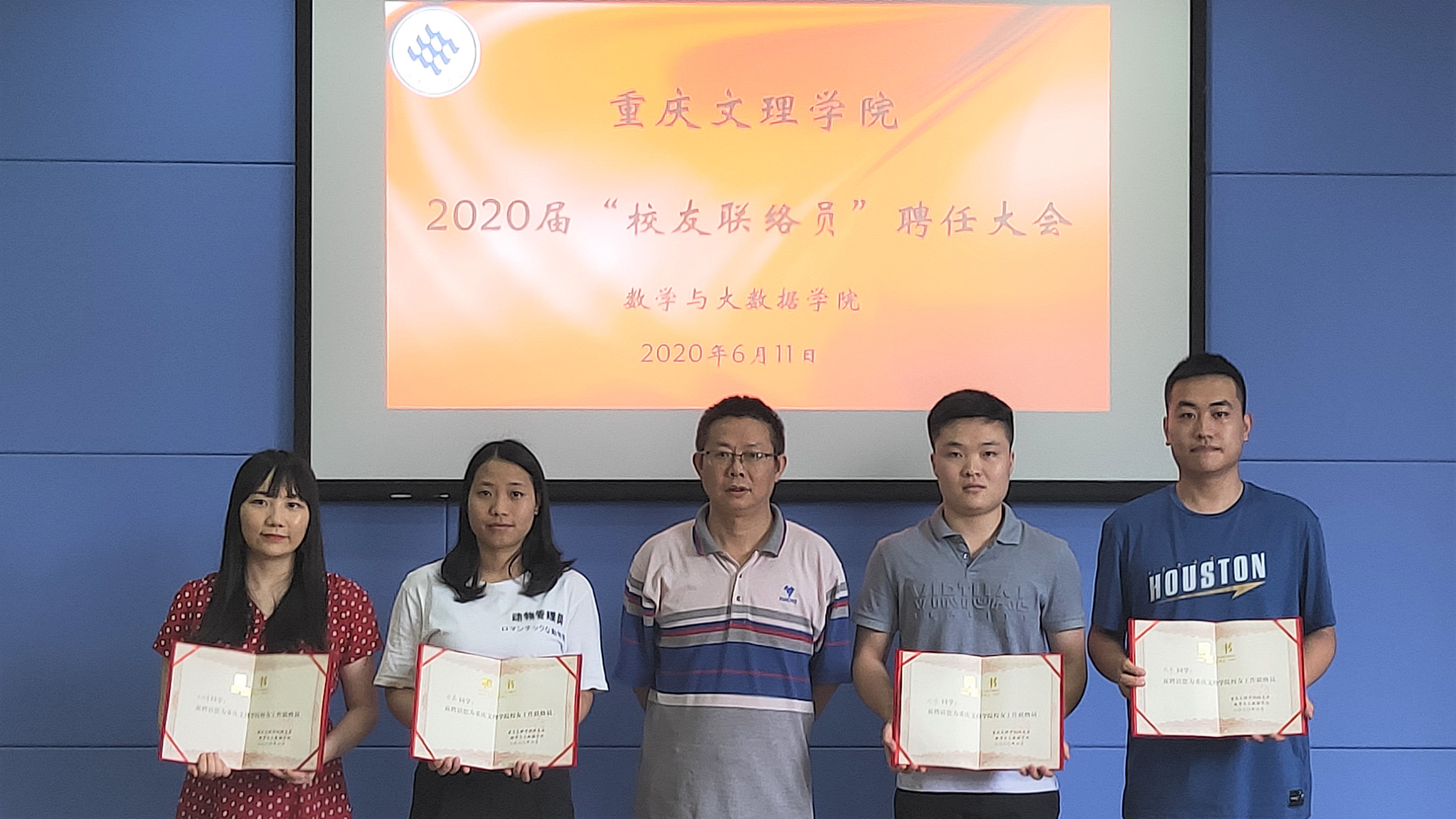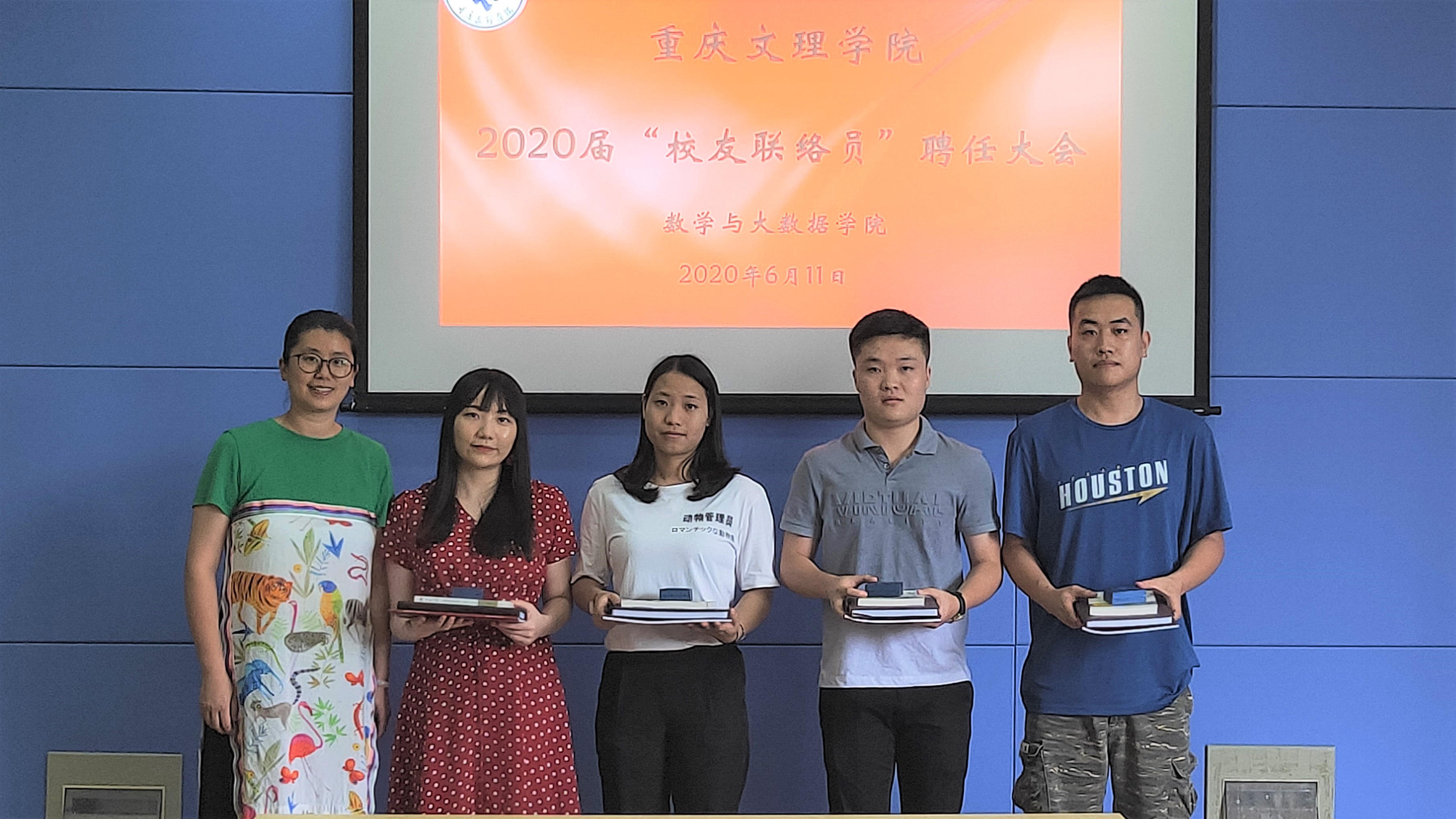黄华副书记首先介绍了本次联络员的聘任程序和基本情况,并宣读了数学与大数据学院《关于聘任代平等担任2020届校友联络员的决定》。随后,余大鹏书记向本次聘任联络员颁发了聘书,李亚老师向聘任联络员送上了校友会会徽、《记忆文理》、《校友之家》和工作记录本。余大鹏书记在最后的讲话中向各位校友联络员顺利毕业表示祝贺,向他们详细讲解了校友联络员的具体工作内容、工作方式和工作方法,希望他们不辜负学校、学院的信任,不辜负老师、同学的期望,积极投身校友会工作,努力搭建学校与校友、校友与校友间的交流平台,加强多方交流联络,让响亮的文理人走到哪里都有回音,为学校的申硕建大贡献自己的一份力。