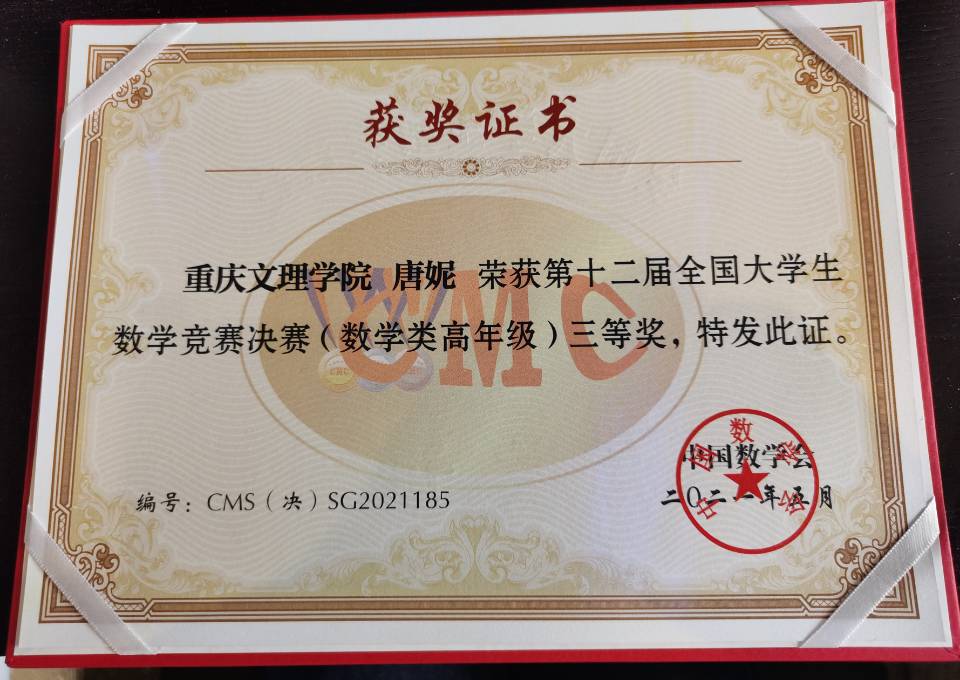 5月15日,第十二届全国大学生数学竞赛决赛在吉林大学成功举行,2017级数学与应用数学(师范)专业学生唐妮荣获数学类(高年级组)全国三等奖。 本次竞赛参赛人数创历史新高,全国共有32个赛区206921人报名参加初赛,从中选拔出668人进入决赛,实际参赛人数646人,其中,数学专业组343人,非数学专业组303人。其中数学类(高年级组)重庆赛区共7人获得决赛资格,分别为M881人、重庆大学2人、西南大学2人、重庆理工大学1人 、第二师范学院1人。