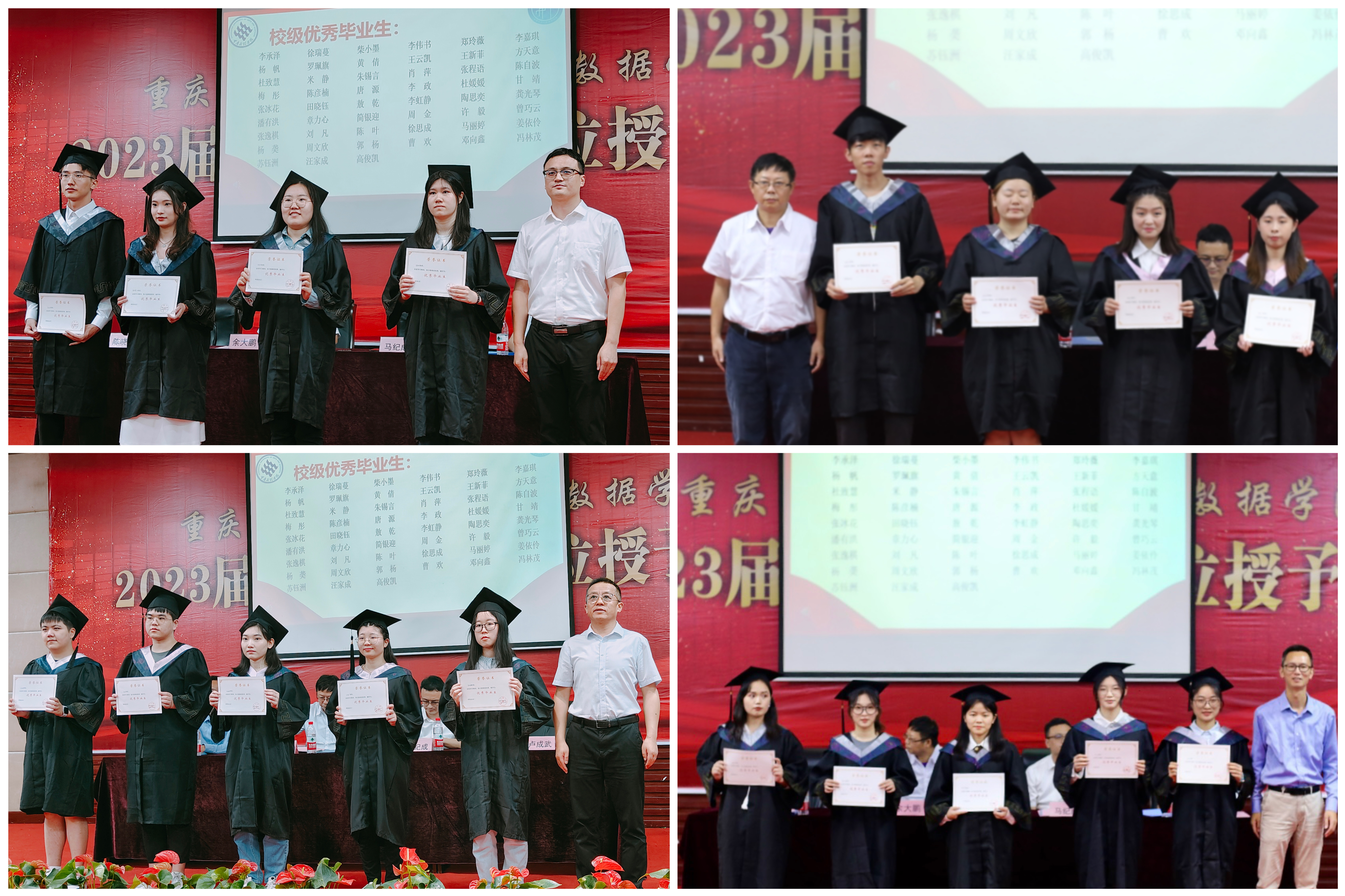 卢成武院长在致辞中首先表达了对毕业生们顺利毕业的祝贺,回顾了同学们青春飞扬的大学生活,勉励同学们数智无惧,勇毅前行,开启人生新征程,为实现伟大中国梦贡献自己的青春力量。马纪成处长宣读《关于表彰2023届优秀毕业生的决定》,为优秀毕业生颁发证书。随后,余大鹏书记、陈晓东副书记分别宣读获得毕业证书和学士学位证书的决定,学士学位授予仪式正式开始,卢成武院长带领教师代表为毕业学生们逐一拨穗和授位。毕业典礼暨学位授予仪式结束后,优秀毕业生数学与应用数学(中外合作)专业李承泽同学做代表发言,优秀毕业生们为老师们献上鲜花,教师代表也为同学们赠送了刻有校训、院训和毕业生姓名的毕业书签。