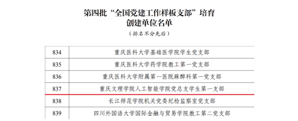 近日,教育部办公厅公布第四批全国党建工作示范高校、标杆院系、样板支部培育创建单位名单,M88学生第一党支部(原人工智能学院党总支学生第一支部)入选全国党建工作样板支部培育创建单位。