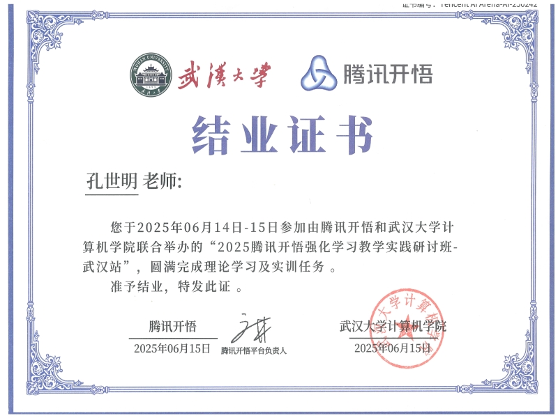 2025年6月14日至15日,M88教师孔世明受邀参加由腾讯开悟联合武汉大学计算机学院举办的《强化学习基础与实践》武汉站培训。此次培训在武汉大学计算机学院B404教室开展,聚焦强化学习前沿技术与教学实践,为高校AI师资队伍建设提供了重要助力。